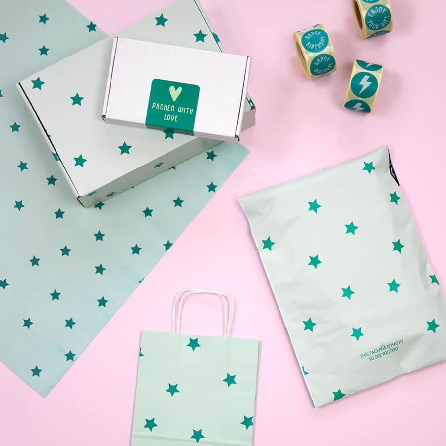 Verleihen Sie dem Versand einen Hauch von Sternenstaub mit den Versandtaschen mit Sternchen. Diese Versandtaschen sind matt hellgrün mit einem dunkelgrünen Sternenmuster, das den Paketen ein einzigartiges Aussehen verleiht und sie sicher von den anderen Paketen abhebt. Das Format 'small' hat eine Größe von 250 x 340 mm und eignet sich damit für den Versand von einem oder zwei T-Shirts oder anderen kleinen Produkten.