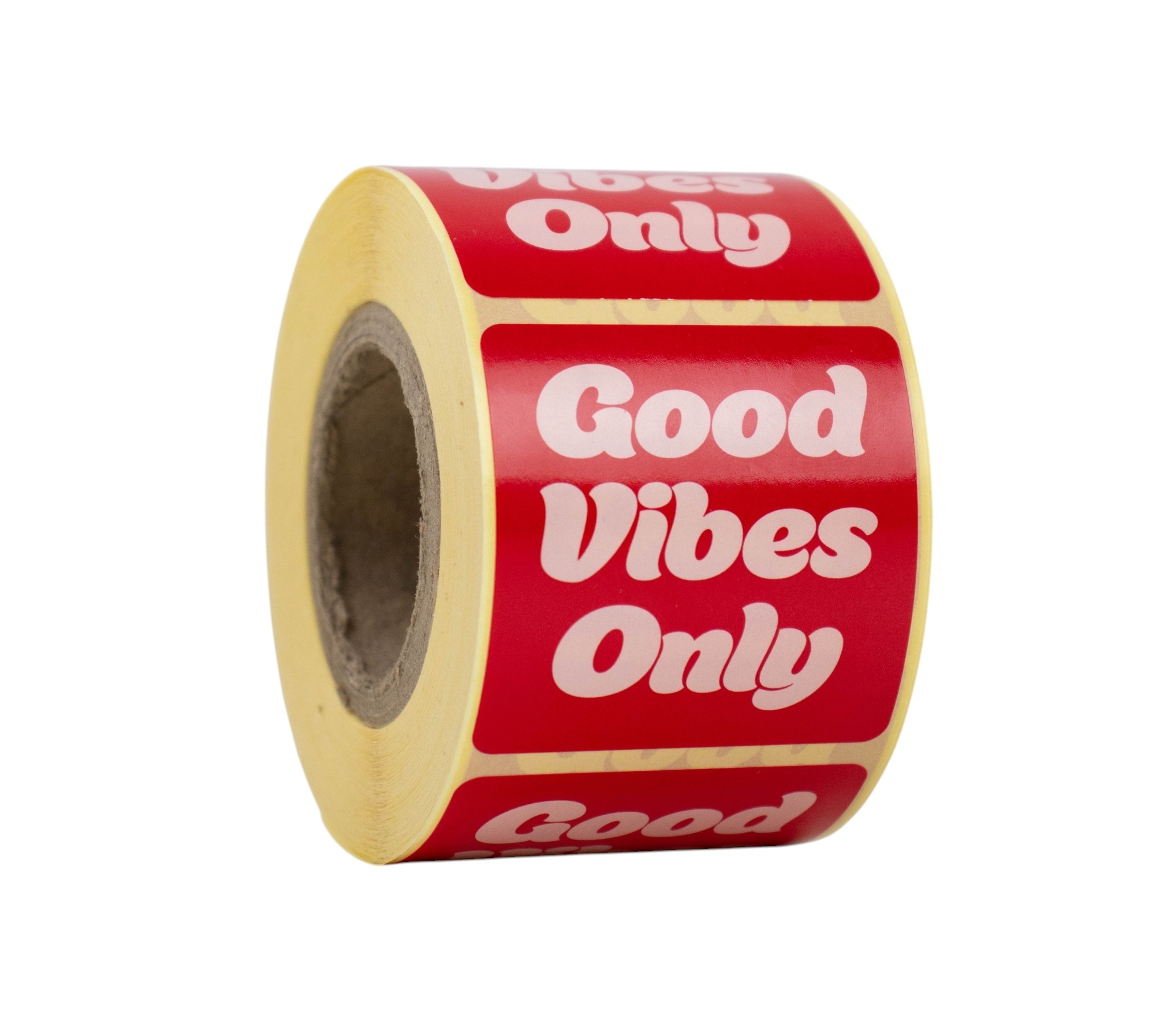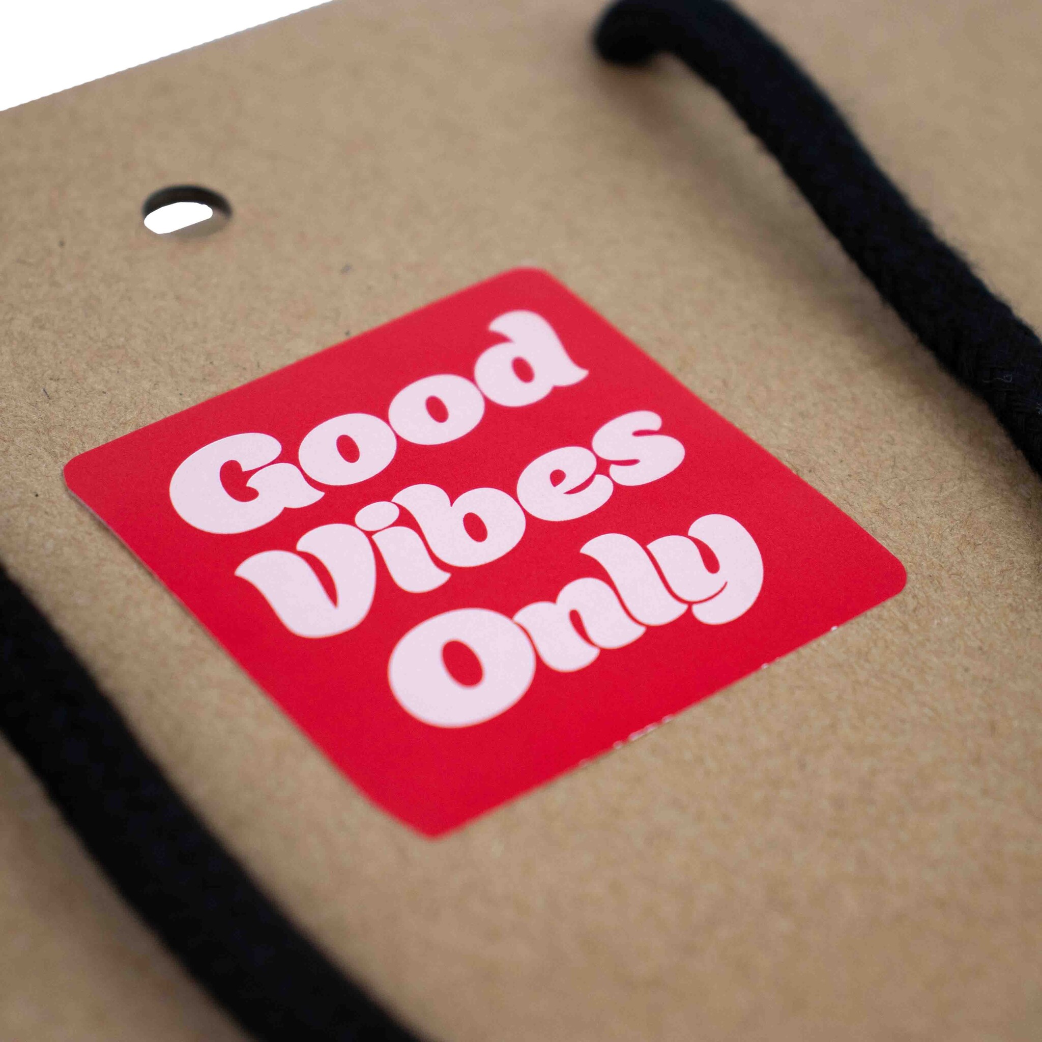 Diese Sticker mit dem Text 'Good vibes only' verleihen Ihren Verpackungen eine positive und auffällige Ausstrahlung. Die Kombination aus Rosa und Rot sorgt für einen modernen und freundlichen Look.