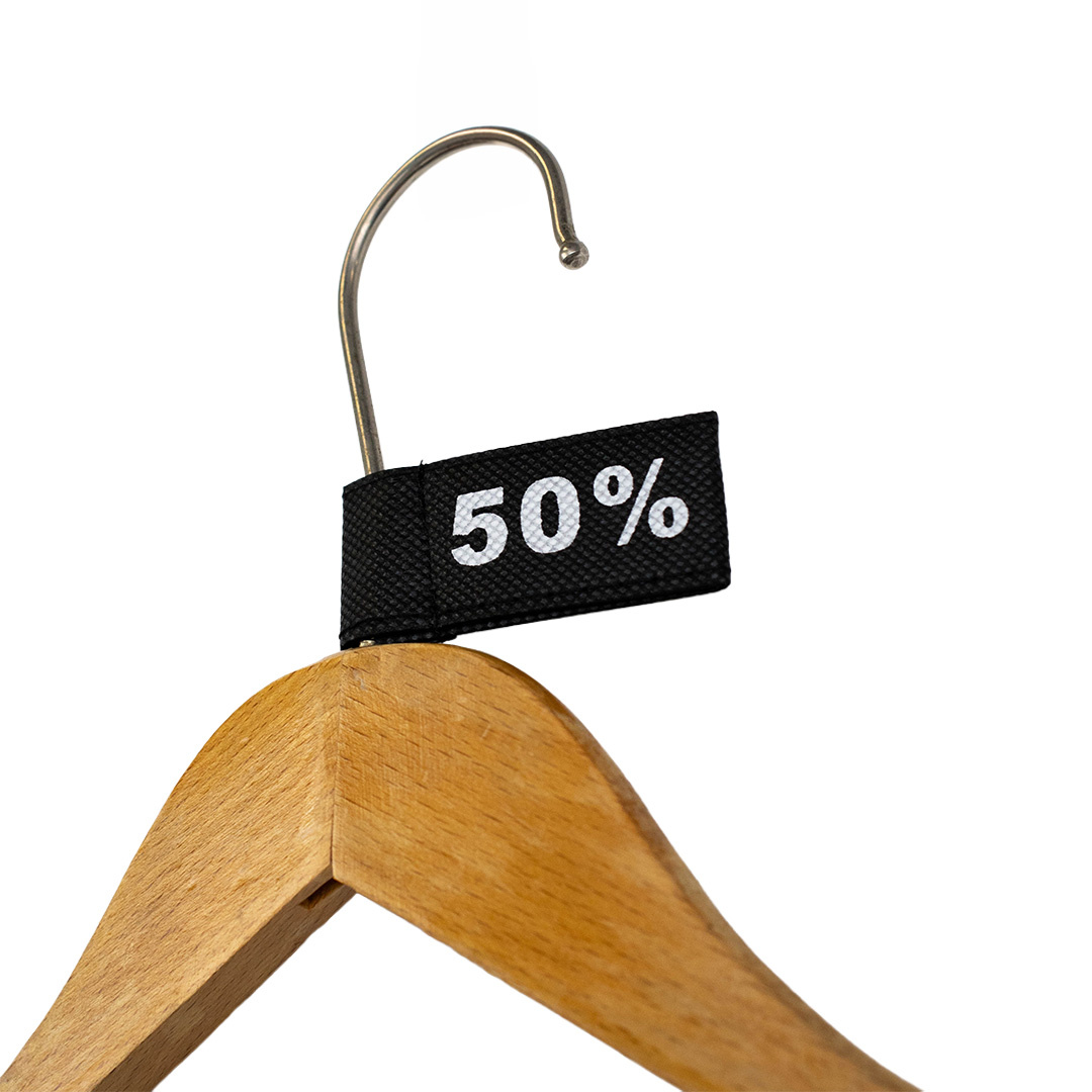 Machen Sie hohe Rabatte sofort sichtbar mit diesen schwarzen 50%-Kleideretiketten. Die Etiketten haben ein Format von 3x6cm und sind zur Befestigung an Kleiderbügeln vorgesehen. Ideal für auffällige Rabattaktionen.