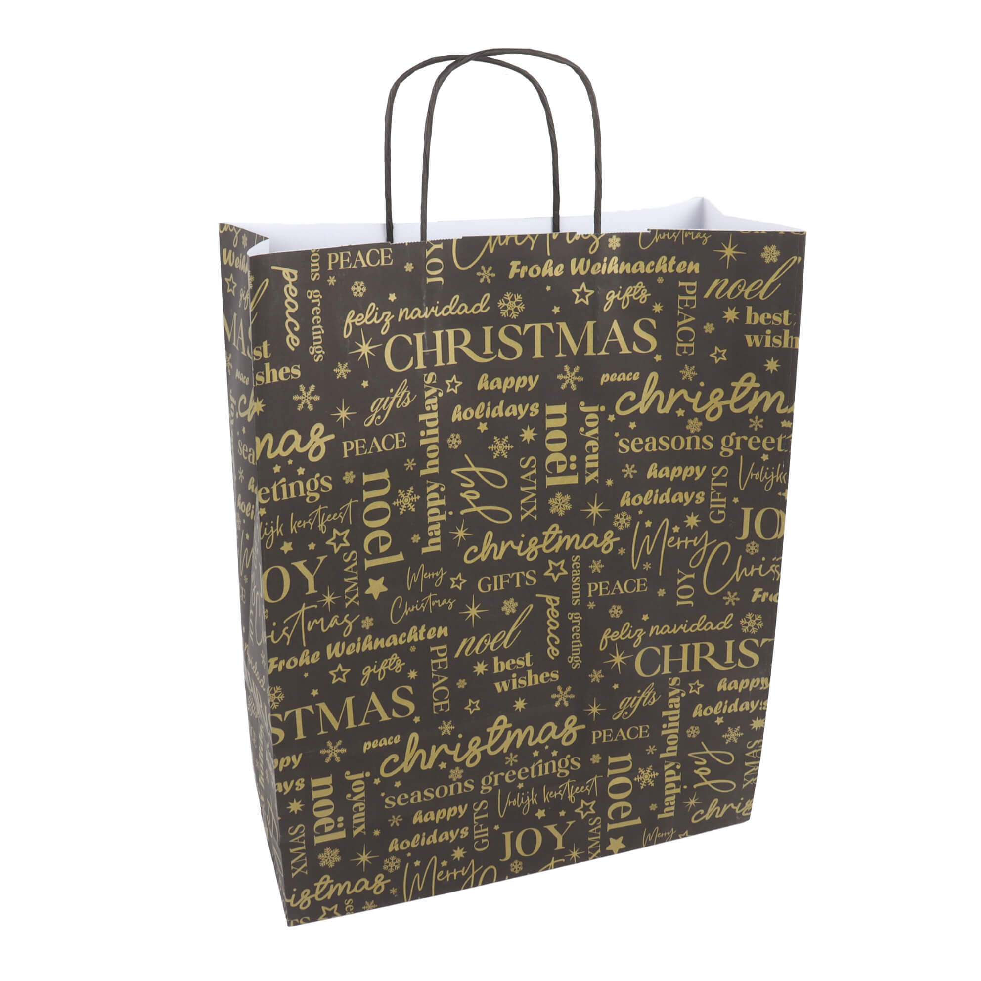 Die Tüten bestehen aus robustem Kraftpapier (120 g/m²) und sind mit flachen Papierhenkeln in Schwarz ausgestattet. Das großzügige Format von 25x12x31cm bietet ausreichend Platz für größere Geschenke. Der mehrsprachige "Merry Christmas"-Aufdruck macht sie universell einsetzbar. Verpackungseinheit: 25 Stück.