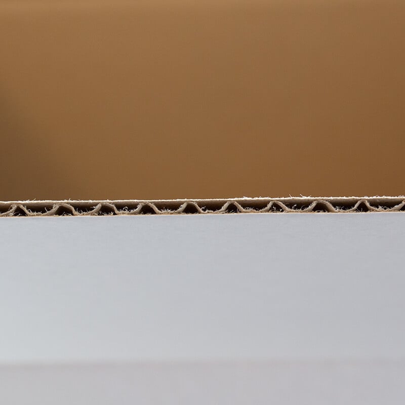 Diese quadratischen Versandkartons im Format 20 x 20 x 20 cm bestehen aus D-Welle. Diese Wellensorte ist feiner und dünner als B-Welle und hat eine Wandstärke von etwa 1,5 bis 2 mm. Dadurch wirkt der Karton besonders sauber und glatt, bietet aber dennoch ausreichend Schutz für leichte bis mittelschwere Produkte. Es handelt sich um sogenannte Faltkartons (FEFCO 0201), die oben und unten über Klappen verschlossen und mit Klebeband fixiert werden.
